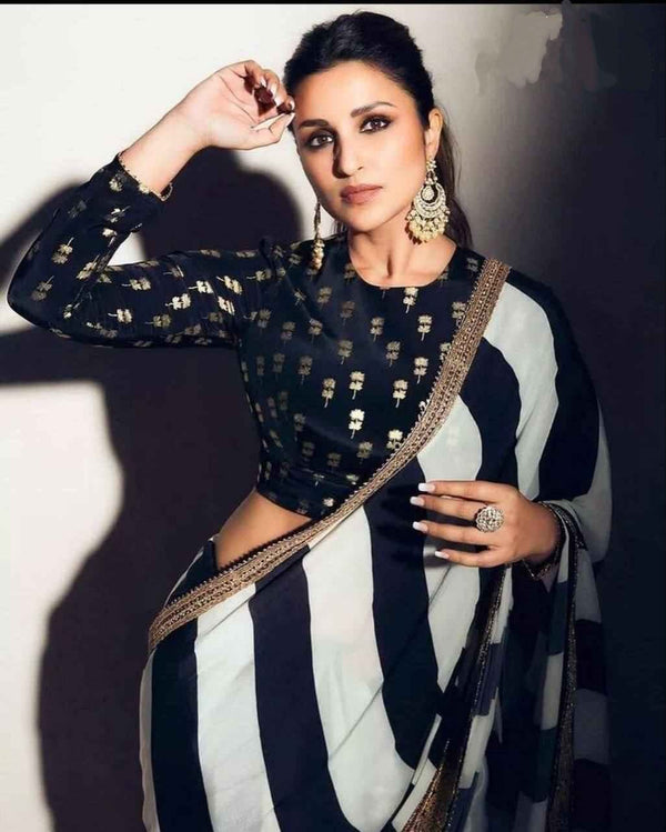 Designer Black & White Striped Georgette Saree with Embroidery – Celebrity Style Party Wear